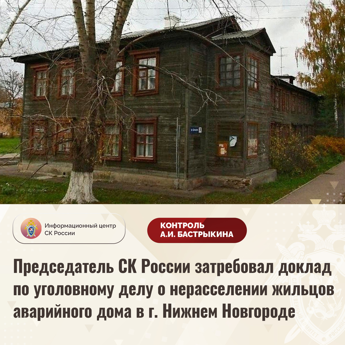Председатель СК России затребовал доклад по уголовному делу о нерасселении жильцов аварийного дома в г. Нижнем Новгороде В приёмную Председателя СК России А.И. Бастрыкина обратилась жительница города Нижнего Новгорода по вопросу длительного нерасселения многоквартирного дома по улице Героя Давыдова. Фундамент здания, 1937 года постройки, просел, кирпичная кладка частично обрушилась, несущие конструкции деформированы, кровля повреждена, на стенах образовались трещины. В 2019 году строение признано аварийным и подлежащим сносу, срок расселения граждан был установлен на декабрь 2022 года. В настоящее время собственникам предлагают жилье маневренного фонда в здании общежития, которое также непригодно для проживания. При этом мер к предоставлению благоустроенных квартир не принято. Выкупная стоимость, предложенная заявительнице, не позволит приобрести равнозначную недвижимость. Ранее указанная ситуация получила распространение в СМИ. А.И. Бастрыкин поручал представить по ней доклад. В СУ СК