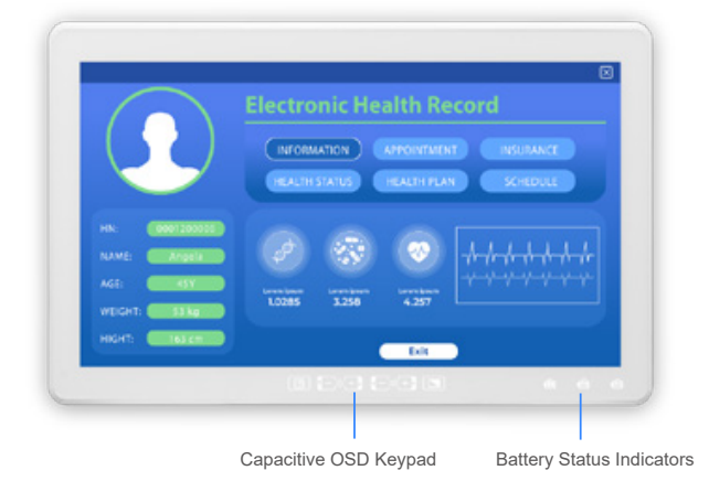 Недавно выпущенный IEI Integration Corp 24-дюймовый медицинский монитор MPOCm-W24 оснащен тремя аккумуляторными батареями и функцией источника питания 5~24 DC. Аккумуляторные батареи позволят монитору сохранить изображение при пропадании питания в сети медучреждения, а также работать на мобильном штативе при транспортировке пациента. При этом монитор может сам послужить источником питания для других маломощных устройств типа компактного компьютера, сканеров, небольшого термопринтера. Монитор собран в пластиковом корпусе с защитой передней панели по стандарту IP65. Экран монитора имеет разрешение 1920 x 1080 точек и размер 23.8 дюймов по диагонали. Яркость дисплея 250 нит, контрастность 1000:1, угла обзора 178/178. Поверхность дисплея защищена покрытием твердостью 6-7H, экранный сенсор проекционно-емкостный и рассчитан на работу в перчатках. Подключение сенсора по интерфейсу USB. Кроме экрана на передней панели находятся 6 кнопок управления меню, индикатор питания и три индикатора состо