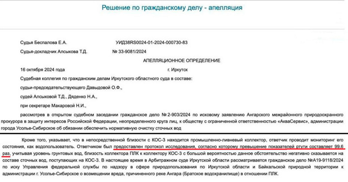 По информации, полученной организацией «Зеленый фонд», предельно-допустимая концентрация превышена почти в 100 раз. История, о которой рассказал в своем ТГ-канале «Зеленый фонд», началась с того, что Управление Росприроднадзора подало иск о взыскании с администрации Усолья-Сибирского более 80 млн рублей за загрязнение Ангары. Основанием для иска стали результаты проверки Росприроднадзора, в ходе которой был установлен факт сброса в Ангару неочищенных сточных вод через городской коллектор. Надзорное ведомство решило, что виновна администрация Усолья, которая владеет очистными сооружениями. Однако когда Арбитражный суд Иркутской области рассмотрел иск, он установил, что администрация не виновата в загрязнении, поскольку оно произошло в ходе работ по ликвидации экологического ущерба на площадке «Усольехимпрома», то есть по независящим от ответчика обстоятельствам. В решении суда сказано, что местная администрация не имеет возможности влиять на работы. «Зеленый фонд» напомнил, что еще в ко