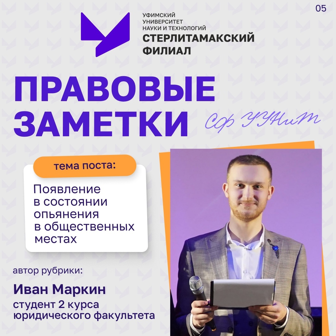 Это новый выпуск рубрики «Правовые заметки СФ УУНиТ». И сегодня мы обсудим любителей «горячительных» напитков, а точнее то, к каким последствиям может привести их появление в общественном месте в не самом подобающем виде. Человек имеет интересную особенность - его нередко тянет к «запретному плоду». Большинство людей хотя бы раз в своей жизни имели опыт употребления веществ, пагубно влияющих на здоровье. Чаще всего в роли таковых выступает алкоголь. Спиртные напитки сами по себе несут мало хорошего, а когда разговор относится мест, относящихся к общественным, то тут уже в дело вступают законодательство и правоохранители. СФ УУНиТ предупреждает: в соответствии со статьёй 20.21 КоАП РФ, появление на улицах, стадионах, в скверах, парках, в транспортном средстве общего пользования, в других общественных местах в состоянии опьянения, оскорбляющем человеческое достоинство и общественную нравственность влечет наложение административного штрафа в размере от 500 до 1500 рублей или администра