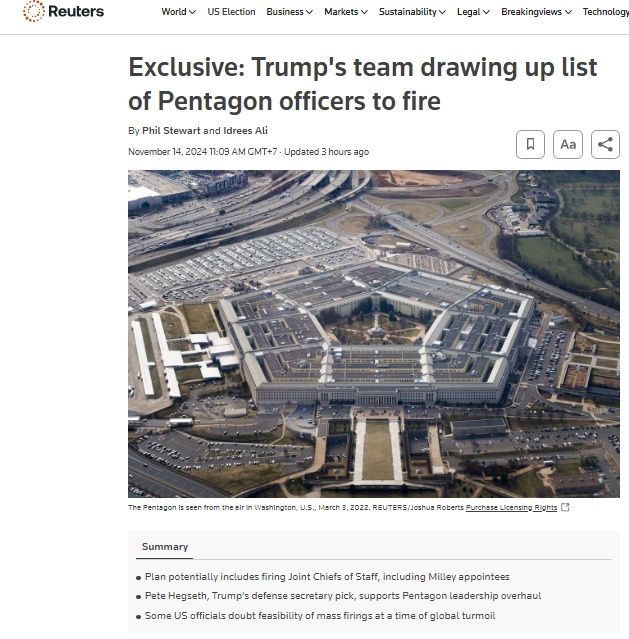 Reuters сообщает со ссылкой на свои анонимные источники, что Дональд Трамп готовится к большим чисткам среди американского генералитета. Переходня команда Трампа сейчас составляет список чиновников Пентагона, которые будут уволены сразу после его возвращения в Белый дом. В этот список, скорее всего, войдут члены Объединенного комитета начальников штабов, который возглавлял генерал Марк Милли, известный как ярый сторонник военной поддержки Украины. По данным агентства, планирование увольнений военных находится на ранней стадии и может измениться по мере того, как администрация Трампа будет формироваться, сказали источники, знакомые с процессом перехода власти. Еще во время предвыборной кампании Трамп говорил об увольнении «сознательных» генералов и тех, кто ответственен за вывод войск из Афганистана в 2021 году. Однако некоторые из его окружения все же сомневаются в массовых увольнениях в оборонном ведомстве. Один из источников сообщает, что новая администрация, вероятно, сосредоточится