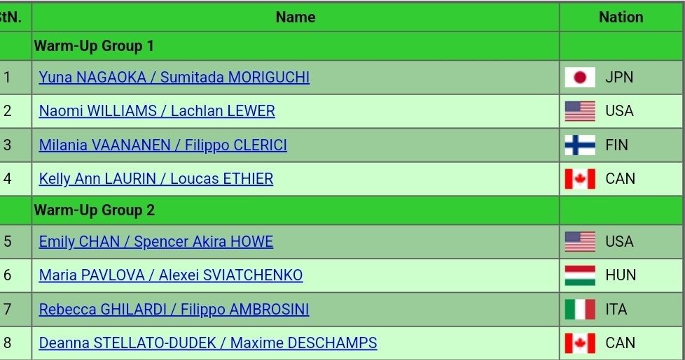 Список участников и порядок выхода на лёд: Подкрутка двойная и второго уровня. Риттбергер не получился - только двойной и с ошибкой. Поддержка хорошая. На выбросе-риттбергере касание льда рукой. Дорожка 3 уровня. Тодесу дали только базовый уровень. Параллельное вращение не параллельно, но по критериям на 4 уровень. В Японии они выступили гораздо лучше, чем здесь. Результат КП: 51.75 Подкрут на третий уровень. На тройном тулупе партнёрша упала. Выброс-сальхов очень тяжело и с ошибкой. Тодес 2 уровня. Комбинированное вращение не получилось - партнёр завалил первое положение, но на 3 уровень выкатали. Поддержка нормальная. Дорожка 2 уровня. И приехали к финалу сильно заранее. Музыка отдельно от фигуристов, вообще не увидела настроения, драйва, хоть чего-нибудь, что бы соответствовало сопровождению; Результат КП: 52.30 Подкрутка на третий уровень в начале. На тройном тулупе партнёр упал. Выброс-флип - чисто. Поддержка нормальная. Вращение плохо - рассинхрон и далеко друг от друга. На дор
