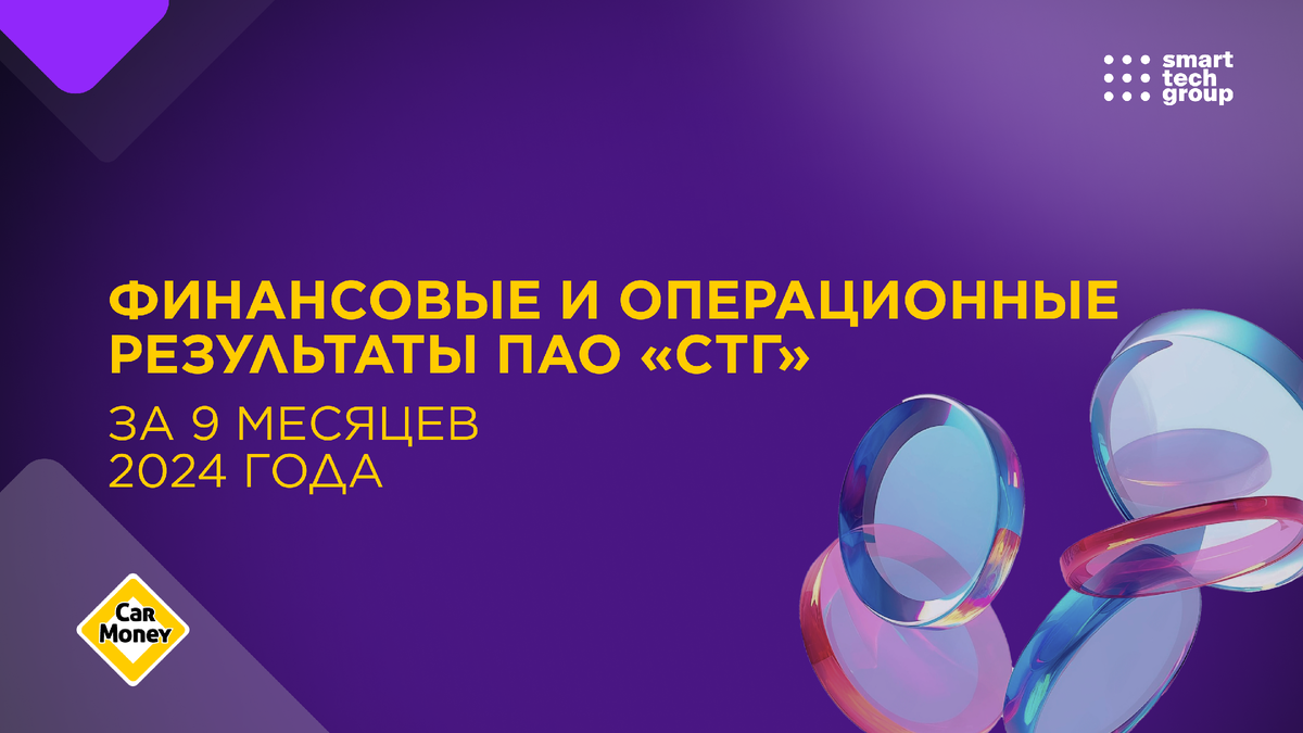 Публичное акционерное общество «СмартТехГрупп» (ПАО «СТГ»), материнская компания финтех-сервиса CarMoney (MOEX: CARM), объявляет операционные показатели и финансовые результаты Группы по МСФО за 9 месяцев 2024 года. Эмитент демонстрирует рост операционных показателей, сохраняя положительную рентабельность и устойчивое финансовое положение, на фоне масштабных инвестиций в новые продукты и технологическую платформу, пересмотра бизнес-модели Группы после заключения стратегического партнерства с ПАО «Промсвязьбанк» (ПСБ).