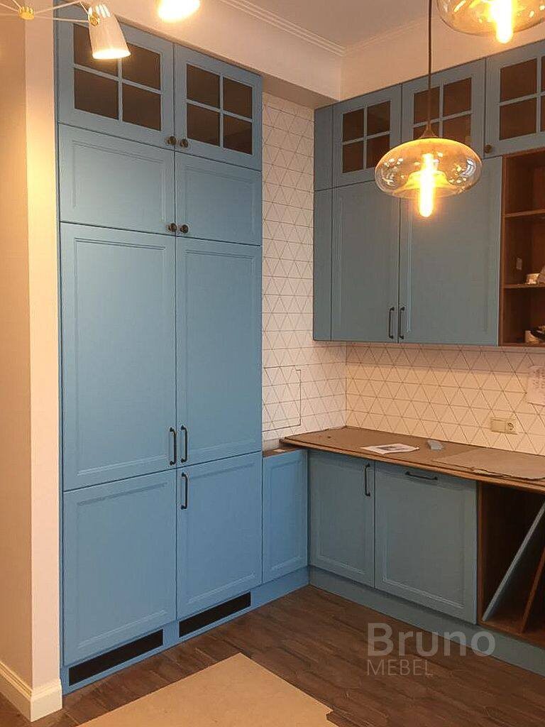 Дизайн-проект этой минималистичной и в то же время элегантной кухни создавался по индивидуальному запросу нашего клиента. Кухня состоит из: ⁃ множества шкафчиков, которые позволяют организовать хранение посуды и кухонных принадлежностей; ⁃ удобной кладовой для хранения круп и солений и т.д; ⁃ качественной деревянной столешницей, за которой будет приятно проводить время во время готовки; ⁃ антресоли, добавляющей стильный акцент и дополнительное пространство для хранения. Эта кухня идеально подходит для создания уютной атмосферы в доме, а ее гармоничные линии и глубокий синий цвет добавляют шарма и стиля. Вам будет приятно готовить в таком просторном и функциональном пространстве! Для заказа и консультации обращайтесь по номерам; - 8 (800) 700 79 08 - СПБ и Ленобласть - 8 (495) 008 17 28 - Москва и область