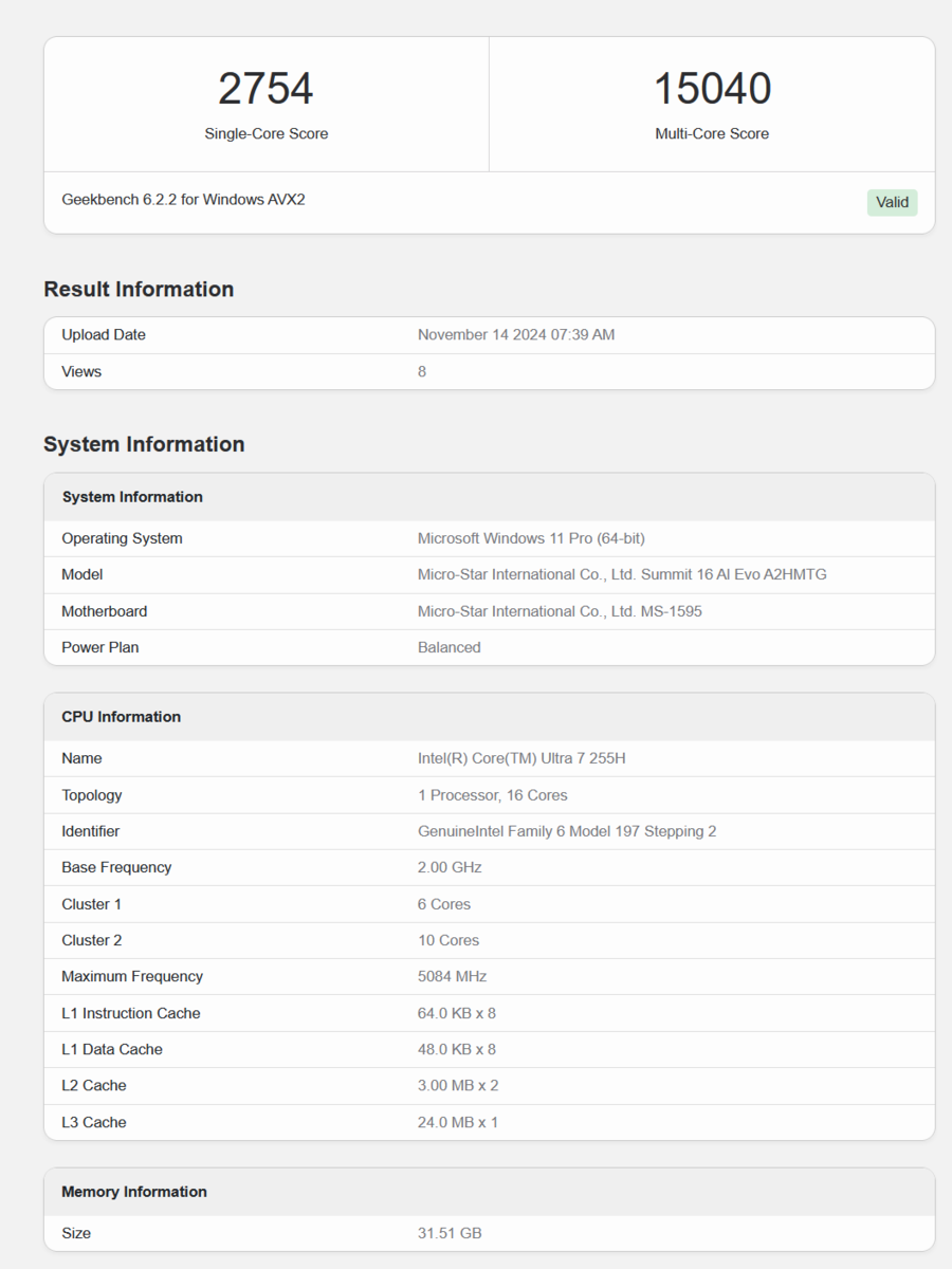 Intel Core Ultra 7 255H оказался до 22% быстрее Core Ultra 7 155H в тестах Geekbench