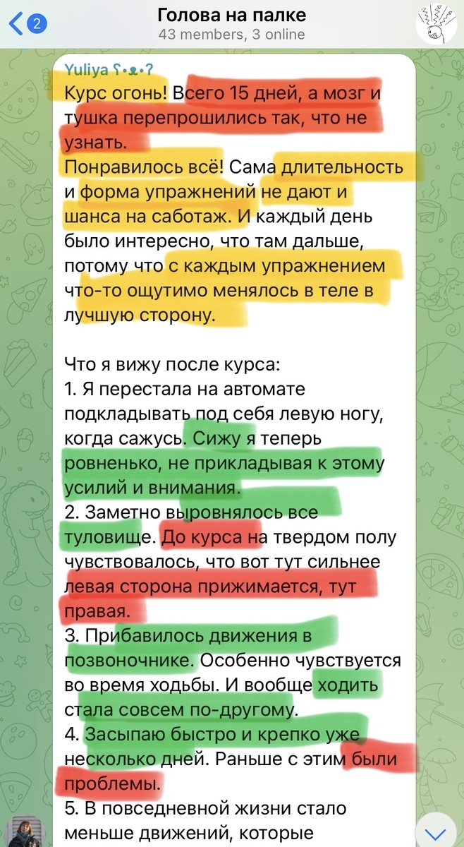 Голова на палке - это название курса). Название может показаться странным. Но курс был именно про это. Как правильно двигать самой тяжелой частью тела - головой. Каждый день мы занимались по 5-10 минут. Но вместо привычного "закачивания" мышц мы учили их работать как единый механизм. Чтобы на каждом участке движения включались только нужные мышцы. Чтобы автоматически убирались с дороги части тела, которые мешают друг другу - да, часто выполняя одно движение мы боремся сами с собой. В результате мышцы, которые обычно перенапряжены - спина - расслабились и удлинились. Те, которые давно выключились из активной работы - живот - пришли в тонус. Как только это произошло, тело выровнялось. САМО. Его не надо постоянно проверять и выравнивать. Оно просто разучилось сворачиваться в бублик. В результате: И самое главное - это только начало. Достаточно запустить эти процессы, и тело начнет само себя чинить. И для этого не нужны долгие и изнурительные тренировки. Хочешь узнать как это сдел