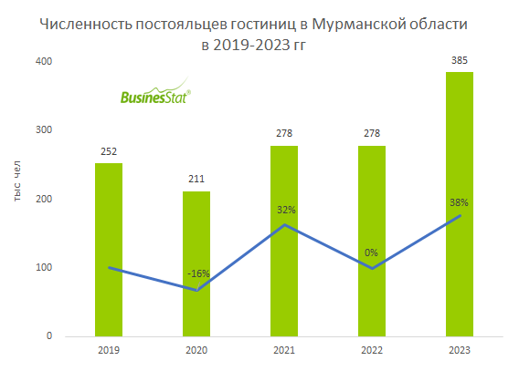 По данным «Анализа рынка гостиничных услуг в Мурманской области», подготовленного BusinesStat в 2024 г, в 2019-2023 гг численность постояльцев гостиниц в регионе увеличилась на 53% с 252 до 385 тыс человек. При этом в 2019 г численность иностранных граждан, размещенных в гостиницах Мурманской области, составляла 48 тыс, или 19% от общего числа размещенных. К 2023 г доля иностранцев сократилась до 6%. Однако благодаря развитию внутреннего туризма туристический поток в Мурманскую область с 2021 г ежегодно рос и в 2023 г достиг 670 тыс чел, что на 46% превысило уровень 2019 г. Несмотря на развитие туристической инфраструктуры, увеличение номерного фонда и мест размещения, по-прежнему наблюдается дефицит гостиниц в Мурманске, Мончегорске, Кировске, вблизи горнолыжных курортов. Из-за нехватки мест размещения некоторые районы области не принимают гостей, хотя имеют потенциал для развития туристического направления (Ковдор, Ловозеро). Строительство и реконструкция гостиниц в Мурманской област