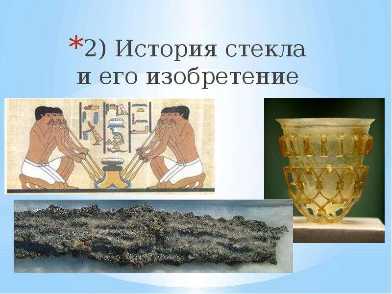 История стекла насчитывает более 5000 лет. Первые известные экземпляры стекла были найдены в Месопотамии, древнем Египте и на других территориях Ближнего Востока. Первые формы стекла, вероятно, появились случайно, когда песок, содержащий оксид кремния, попал в огонь, и под действием высокой температуры начал плавиться. Эта первобытная форма стекла использовалась для создания небольших бусинок и декоративных предметов.