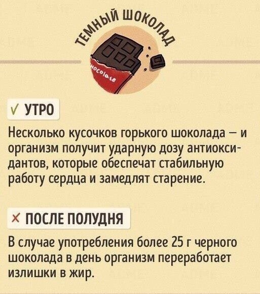 Доброго времени суток, друзья! Всех приветствую на своём канале. Если вы заглянули на эту страничку, значит вам важны вопросы правильного питания и похудения. Сегодня для вас я подготовила информацию, которая может быть интересна и пригодится вам. Мы привыкли есть свои любимые продукты в любое время дня или вечера.А может быть и ночью 🤭😊 А оказывается, существует определённое время для употребления тех или иных продуктов. Вот такая информация к размышлению. На завтрак каша молочная овсяная долгой варки-200 г. Масло сливочное-15 г. Яйцо всмятку. Цикорий с молоком-180 г. Хлеб ржаной-21 г. На перекус бутерброд с говяжьим языком. Чай зелёный. На обед щи из квашеной капусты с куриной грудкой-218 г. Салат из свежих огурцов со сметаной-62 г. Хлеб ржаной-20 г. На второй перекус яблоко. 🍏 На ужин овощное рагу-119 г. Голень куриная запечённая-79 г. А вы как относитесь к тому, что определённые продукты надо употреблять в определённое время? Поделитесь в комментариях. Очень интересно