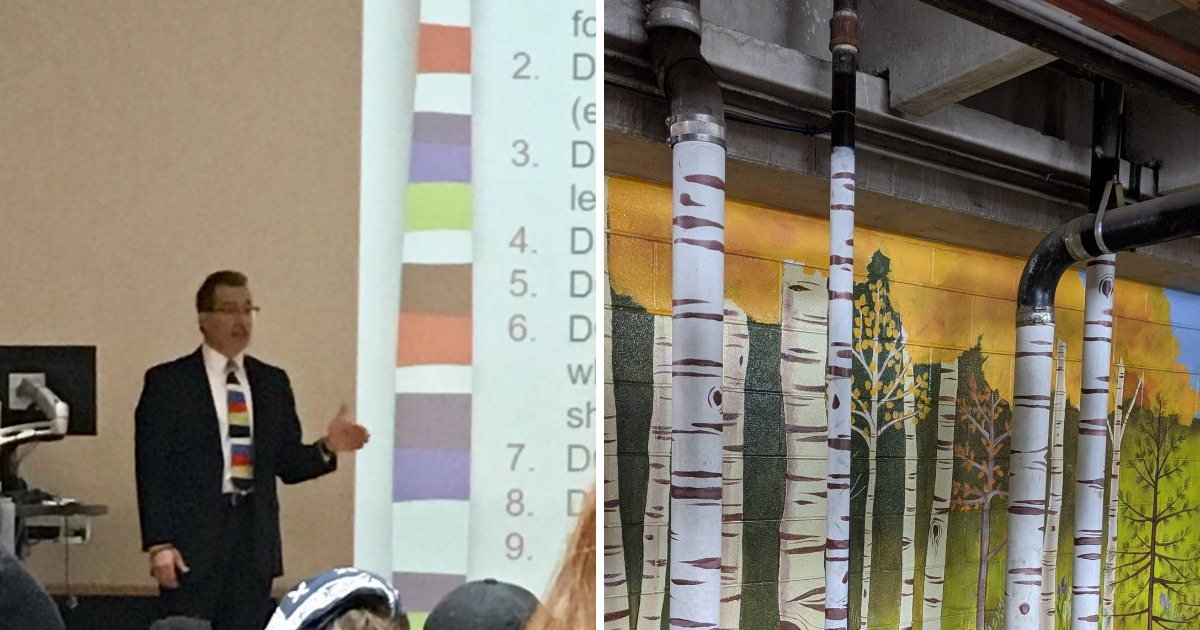 В этом парковочном гараже трубы окрашены в тон фреске с изображением берёз