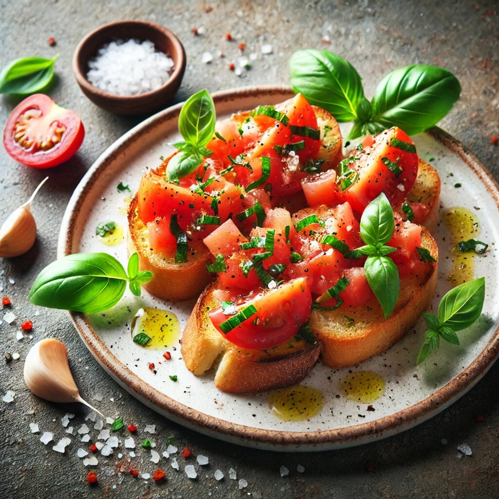 - Выложите смесь из помидоров на каждый кусочек багета и украсьте свежим базиликом. При желании можно сбрызнуть ещё немного оливковым маслом.