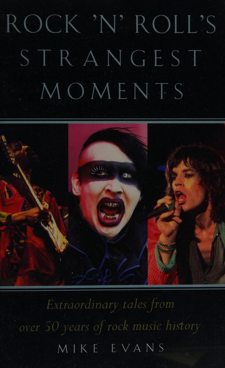 "САМЫЕ СТРАННЫЕ ИСТОРИИ ИЗ МИРА РОК-Н-РОЛЛА" Mike Evans - "Rock'n'Roll Strangest Moments. Extraordinary tales from over fifty years of rock music history." (2006) "С тех пор как рок-музыка впервые объединила скромные начинания блюза, кантри и поп-музыки начала 1950-х годов, она превратилась в дико разнообразный жанр легендарных излишеств, сочетающий героический эгоизм с возмутительными историями о разврате. По своему следу она оставила наследие из тысяч странных и замечательных историй о некоторых из самых больших, ярких (и самых озорных) суперзвезд мира. Мы все читали о швырянии телевизоров и разгроме гостиничных номеров, но знаете ли вы... Устойчивый миф о поклоннице Led Zeppelin, которая получила интимный «вкус» морепродуктов; или о предполагаемой любви Марианны Фейтфул к кондитерским изделиям; и, что любопытно, почему Meatloaf' так назван? Это истории настоящих героев самых странных событий рока; от изобретательного увековечения интимных мест рок-бога Джими Хендрикса в гипсе до тог