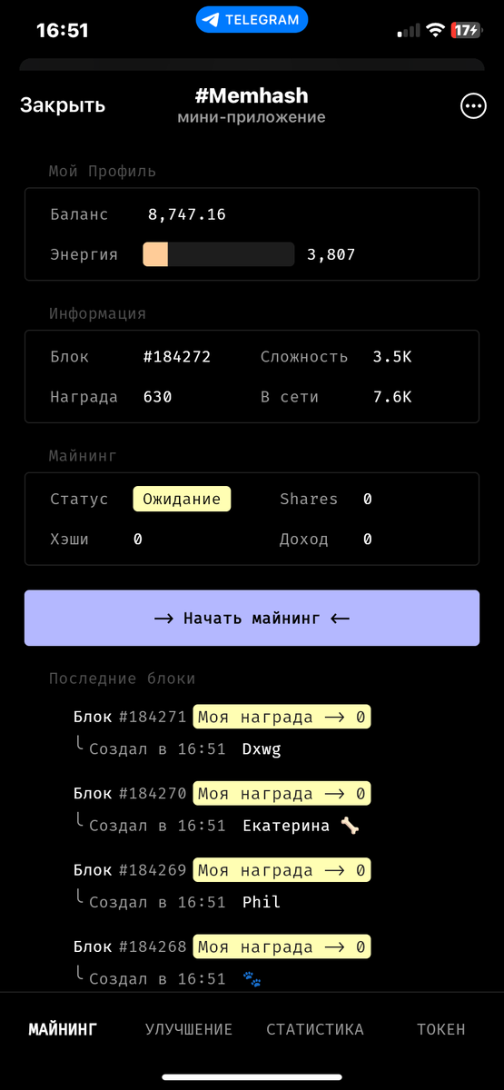 Недавно в Telegram запустился новый проект под названием MemHash, предлагающий уникальную возможность майнить криптовалюту прямо в мессенджере. Благодаря боту memhash_bot пользователи могут добывать токены, не покидая приложения. В этой статье разберем особенности проекта и шаги, чтобы начать майнинг. Майнинг в Telegram — уникальная концепция, которую еще никто не реализовывал в таком масштабе. MemHash работает всего пару недель, но уже привлек несколько тысяч пользователей. Вспомним первые криптоигры, такие как Notcoin, которые были выгодными для ранних пользователей, но со временем появились только их аналоги. Пока в MemHash около 10 000 участников — это хороший показатель для проекта, ориентированного на активное сообщество, которое будет взаимодействовать с токеном.