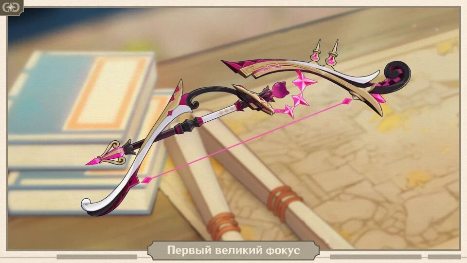 ㅤПервый великий фокус — легендарный лук в Genshin Impact, появившийся в игре в версии 4.0. В этом гайде мы расскажем об этом оружии всё. «Сценический реквизит, в прошлом используемый «великим иллюзионистом». И его тайна наконец-таки была раскрыта: на самом деле это необыкновенное оружие» Редкость: 5⭐ Способ получения: В Молитве оружия (идет параллельно с Молитвой персонажа «Волшебство света и тени» (баннер ) Тип: Стрелковое Базовая атака на 90 уровне: 608 Доп. стат на 90 уровне: 66,2% Крит. урон Пассивная способность с 1 по 5 пробуждение: Слався, Парсифаль! ㅤУвеличивает урон заряженной атаки на 16-20-24-28-32%. Предоставляет 1 уровень Уловки за каждого персонажа того же элемента в отряде, что и экипированный персонаж (включая экипированного персонажа). За каждого персонажа отряда с другим элементом составляет 1 уровень Актёрского мастерства.