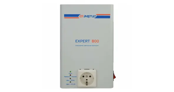 Энергия Expert 800 функционирует при минимальном входном напряжении 90 В и максимальном — 310 В, демонстрируя коэффициент полезного действия в 97%. Выходной сигнал имеет идеальную синусоидальную форму. В устройстве предусмотрена цифровая индикация, которая показывает текущее входное и выходное напряжение.