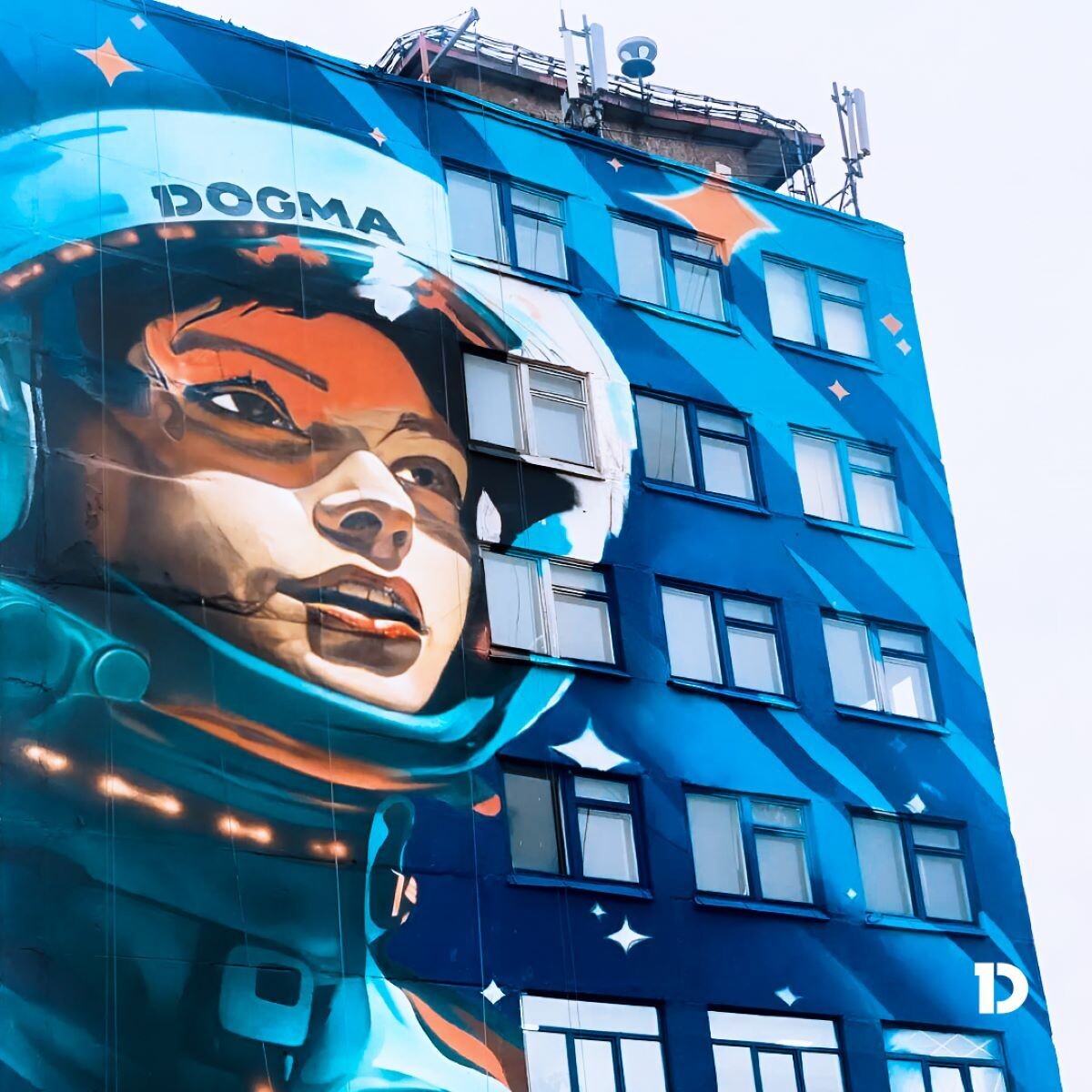 Федеральный девелопер DOGMA привлек граффити-художников для создания 25-ти метрового изображения на фасаде здания на улице Болдина, 22. Вскоре здесь появится новый офис продаж жилого квартала «Космопарк». Граффити-художники завершают работы по отрисовке мурала на фасаде 7-этажного здания. В высоту изображение достигает 25 метров, в ширину – 16. Предварительно художники провели локальную реставрацию фасада. Мурал – объект уличного искусства, он отличается от граффити тем, что содержит в себе художественный смысл и эстетическую ценность для урбанистики. В основу концепции DOGMA заложила идею силы движения. Образ молодой девушки олицетворяет стремление к открытиям, созданию новых миров, исследованиям и преображению пространства. Характерный взор, устремленный вверх, формирует ощущение развития, а композиция в целом подчеркивает смысловую связь с контекстом и идеологией строящегося жилого квартала «Космопарк». «Мы с интересом взялись за идею нетривиально оформить наш офис в Калуге и рады,