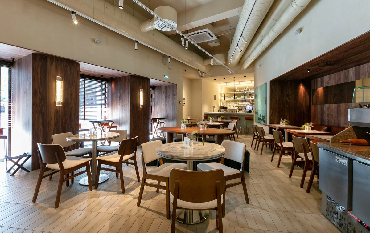 Шпонированные панели обладают множеством преимуществ. Они не только красиво выглядят, но и обеспечивают дополнительную изоляцию, защищая помещение от шума и сохраняя тепло. Это особенно важно для ресторанов, где комфорт гостей стоит на первом месте.