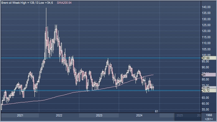 Причина снижения — вероятный избыток предложения в 2025 году. График нефти Brent интервалами в 1 неделю Morgan Stanley снизил прогноз цен на нефть в преддверии ожидаемого профицита в 2025 году, поскольку геополитическая неопределенность на Ближнем Востоке и в США уже достигла пика, считают аналитики банка. Morgan Stanley прогнозирует, что цена Brent в 1 квартале 2025 года составит $72 за баррель по сравнению с предыдущими ожиданиями $77,5 за баррель. Банк снизил свой прогноз роста спроса на нефть. В 2024 году по обновленным ожиданиям спрос вырастет на 800 тыс. баррелей в сутки (предыдущий прогноз +850 тыс. б/с). Прогноз роста спроса на нефть в 2025 году: +950 тыс. б/с (предыдущий прогноз +1,1 млн б/с). Превышение предложения над спросом по-прежнему прогнозируется на уровне 1,3 млн б/с, поскольку ОПЕК отложила увеличение поставок еще на месяц. Текущее соглашение о поставках ОПЕК+ останется в силе на встрече 1 декабря, считают аналитики банка. Результаты выборов в США могут «значительно»
