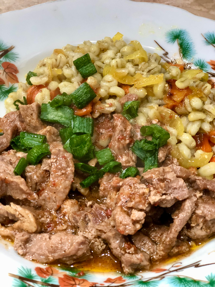 Перловочка со свининой, грибочки с лучком-сельское меню в середине недели