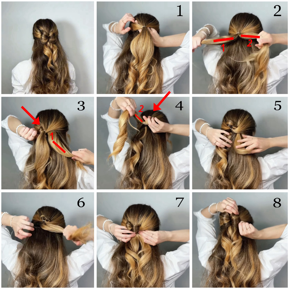 Очень быстро и просто можно сделать красивейшую прическу! Сохраняй себе пошаговую схему! 1. Завязать из верхней части волос хвостик. 2. Разделить хвостик на две равные части. 3. Над хвостиком слева проделать дырочку и по направлению сверху вниз просунуть первую часть хвостика в эту дырочку. 4. Над хвостиком справа проделать такую же дырочку. 5. Просунуть в неё правую часть хвостика. 6. Объединить вместе кончики и связать их тонкой силиконовый резинкой. 7. Затянуть хвостик. 8. Расправить получившиеся валики по бокам. Прическа готова! Вам нравится прическа бантик из волос?