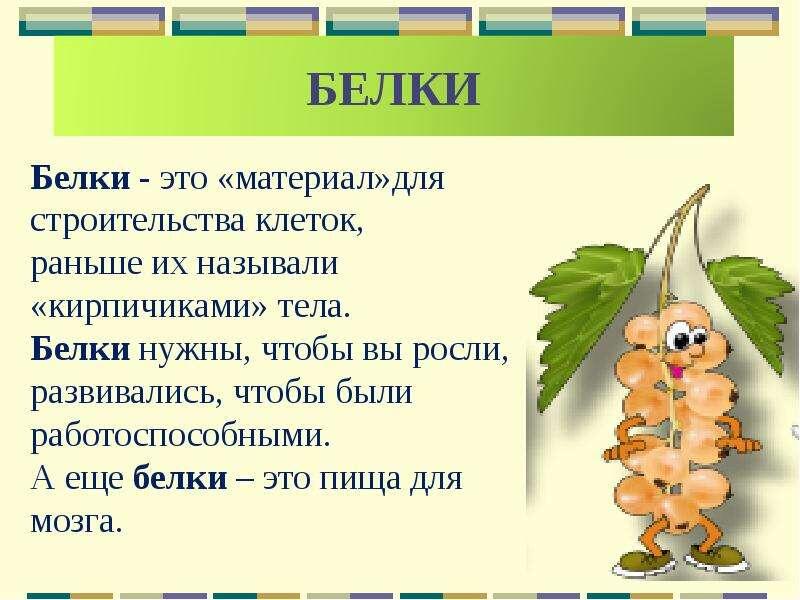 Белки - это строительный материал для тела, белки используются для поддержания мышц, для крепкого иммунитета, для передачи сигналов между клетками.