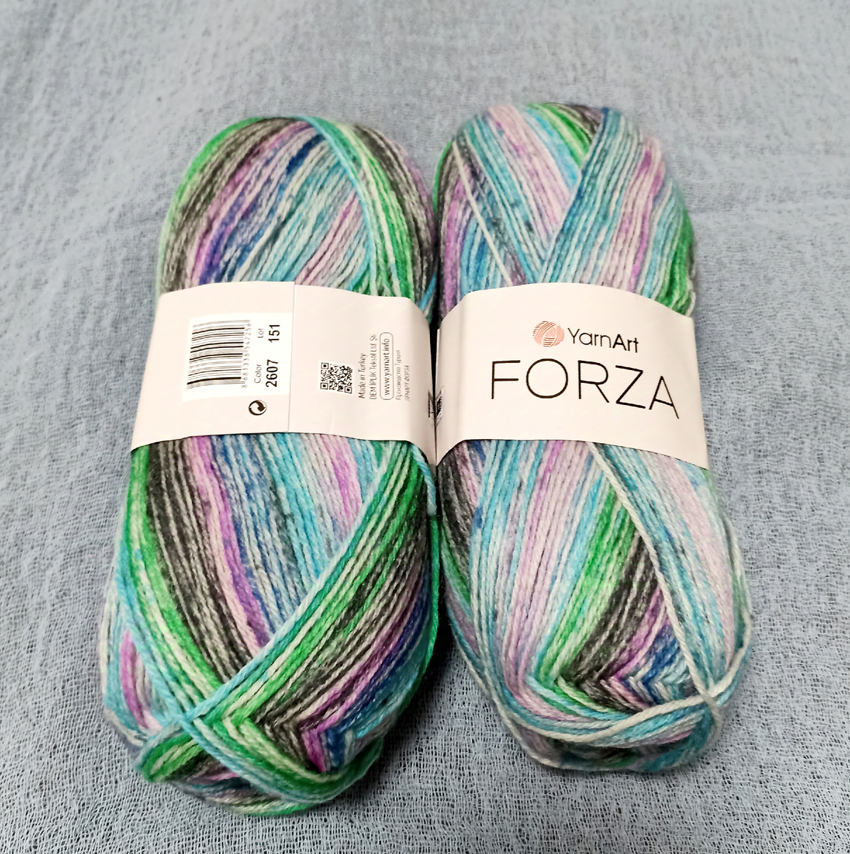 Начнем с носочки. Все артикулы классическая носочка 75/25, 400-420м/100г. 1. Yarn Art Forza цвет 2607. Первый раз беру эту пряжу. Расцветки, которые они выпустили сначала, мне не особо нравились, да и отзывы были не очень. Новые цвета поинтереснее, и я взяла пару моточков на пробу.