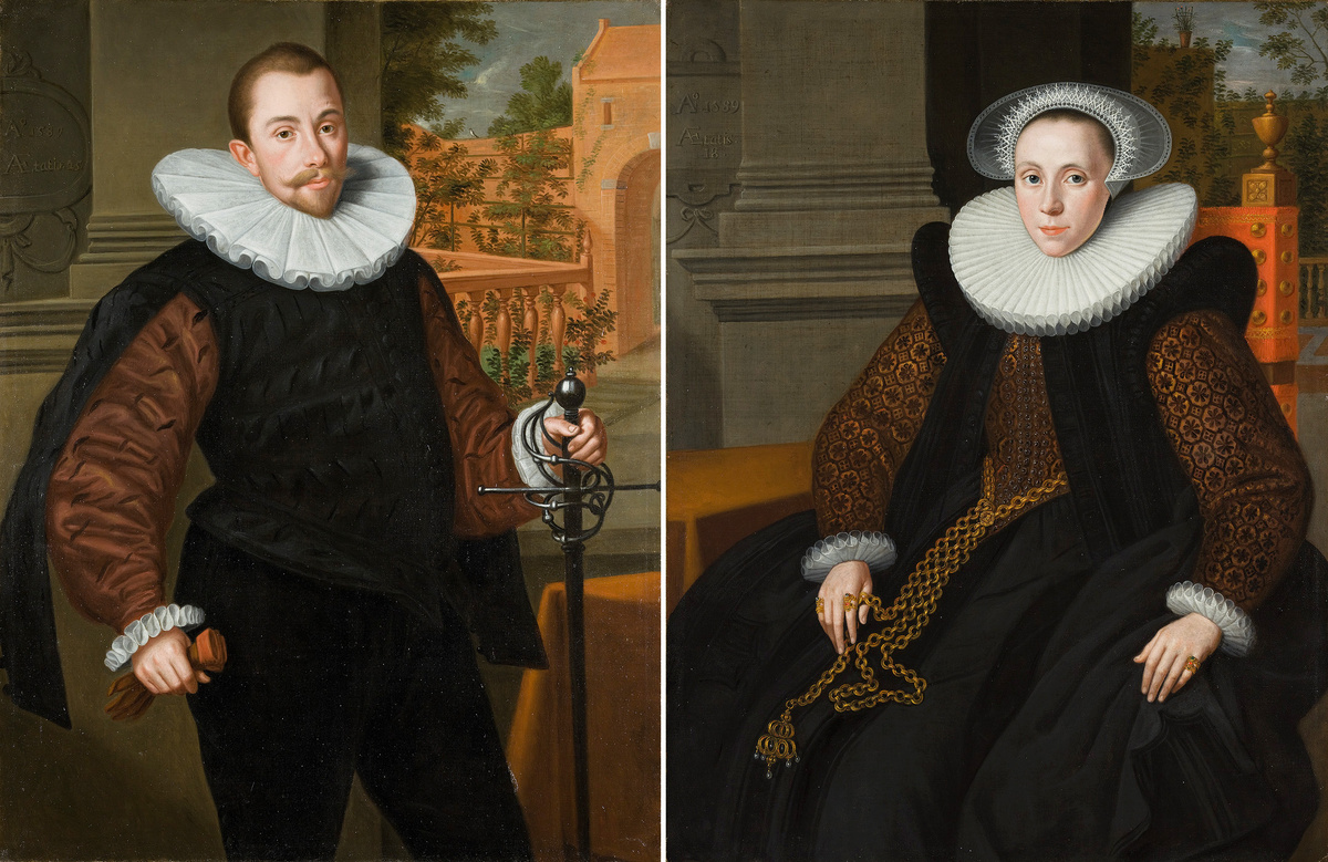 Перед нами две картины неизвестного нидерландского художника XVI/XVII веков. Они являются копиями двух картин также нидерландского художника Питера Питерса Старшего (I) (1540-1603), которые сейчас находятся в частной коллекции (представленные же картины можно увидеть в Амстердамском историческом музее). Слева мы видим Cornelis Jorisz. Roodhoorn / Корнелиса Йориса Рудхорн (1564-1599), торговца сельдью, который жил в доме "in den Rooden Hoorn" ("в красном роге") по адресу Nieuwendijk 35 в Амстердаме. Он стоит с великолепной рапирой в руках. Помимо того, что Корнелис был торговцем, он также был местным политиком и членом совета директоров приюта в Амстердаме. В 1588 году Корнелис женился на Гритге Виллемсдр Бакер (1571-1624), представительнице богатой семьи Бакер, и у них было по крайней мере трое детей. Самым известным из них стал Виллем Корнелис Бакер (1595-1652). Он был влиятельным амстердамским политиком в Амстердаме. А также участвовал в реконструкции Новой Церкви и Новой Ратуши