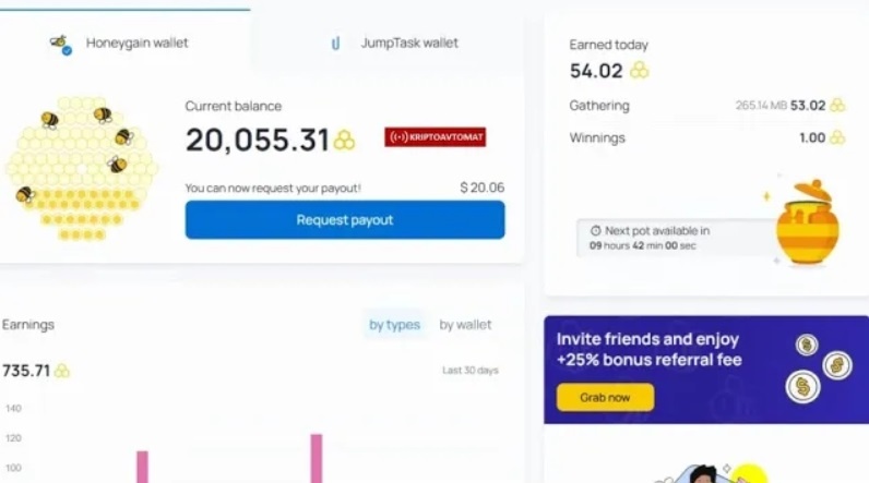 Друзья, всем привет и сегодня мы рассмотрим заработок с помощью сайта HoneyGain (партнёрский материал). Для того чтобы начать работу, переходим по ссылке (партнёрский материал) и сразу же получаем приветственный бонус, далее проходим несложную регистрацию и оказываемся в личном кабинете. Далее нажимаем "Download" и выбираем программу для заработка в зависимости от Вашего гаджета. У меня она работала в фоновом режиме, на ноутбуке, и поэтому я скачивал для Windows. Суть заработка заключается в том, что программа висит у Вас в трее, в фоновом режиме, и постепенно приносит доход. Важно, что если у Вас не безлимитный интернет, а Вы платите за каждый потраченный мегабайт трафика, то данный способ заработка Вам не подойдёт, так как расходы на интернет могут превышать заработок с программы HoneyGain (партнёрский материал). Чтобы дополнительно увеличить доход, Вы можете также ежедневно открывать горшочек с мёдом из которого Вам будет выпадать ещё несколько кредитов. 10 кредитов равняются одному