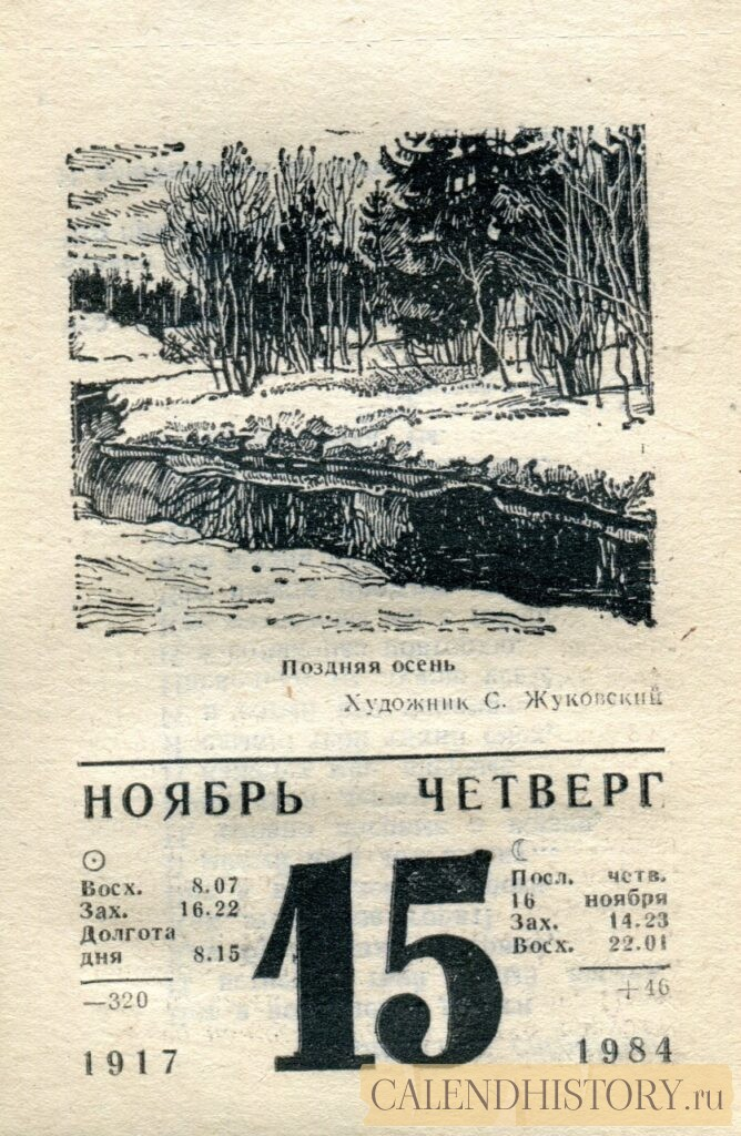 Итак, сегодня 15-го ноября и у нас на календаре 1984-й год. Перед нами листок советского календаря для женщин за этот день. На календаре у нас четверг - 15 ноября 1984-го года. Поздняя осень