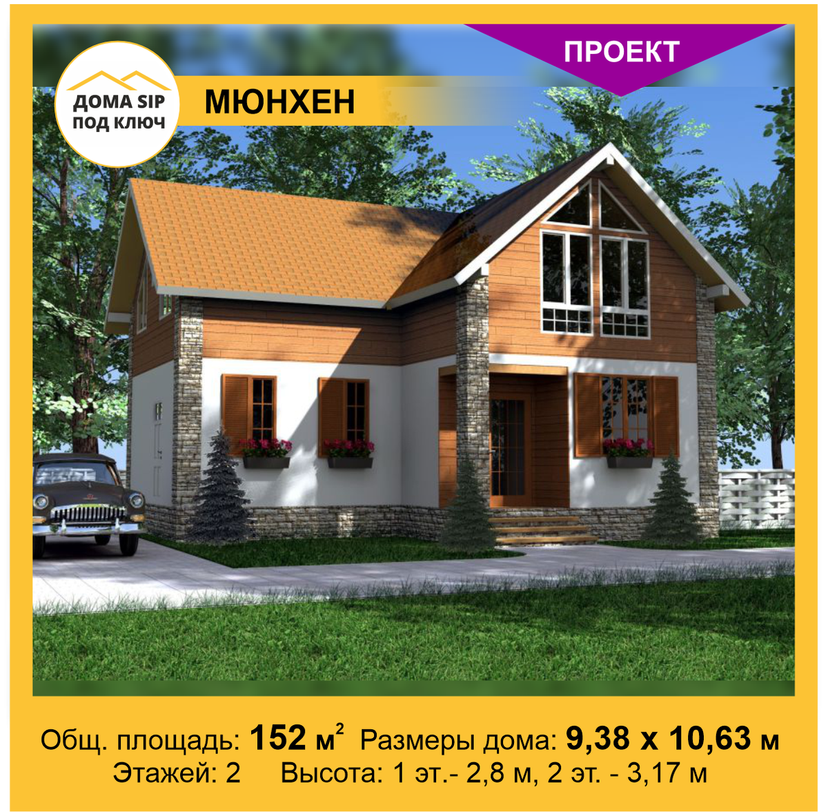 МЮНХЕН 🏠 Проект СИП-дома в стиле… А, собственно, какой это стиль? Эклектика? Да, это тоже стиль. И иногда именно эклектика даёт возможность выразить в архитектуре индивидуальность, гармонично сочетать разные направления и дизайнерские решения. ✨Именно таким индивидуальным и эклектичным получился проект МЮНХЕН. С одной стороны, в нём угадываются черты альпийского шале❄: комбинация различных материалов во внешней отделке, покатая крыша, высокий мансардный этаж. С другой, это типичная европейская классика🏛: Т-образная планировка, симметричность, компактные окна на первом этаже и небольшая веранда. Вот так на стыке двух стилей получился стильный, комфортный и очень функциональный проект СИП-дома МЮНХЕН. Дом достаточно просторный (152 м2) и имеет Т-образную планировку, которая условно делит его на две симметричных части. На первом этаже расположена большая гостиная, кухня-столовая, спальня и небольшой санузел. На мансардном этаже – 3 спальни и просторная ванная комната. Панорамные окна на