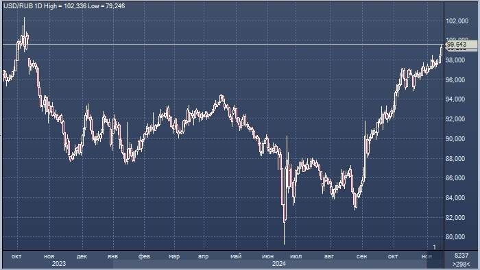 Низкое предложение валюты экспортерами при растущем спросе на валюту со стороны импортеров. Курс доллара к рублю расчётный, фьючерс, вечный фьючерс и межбанк. Курс евро к рублю расчётный, фьючерс, вечный фьючерс и межбанк. Курс юаня к рублю биржевой, фьючерс, вечный фьючерс и межбанк. Усиление дисбаланса валютного рынка способствует ослаблению рубля, считает эксперт БКС Экспресс Дмитрий Бабин. "Фьючерсы на пару USD/RUB в четверг впервые с октября 2023 года приближались к психологически важному уровню 100 руб. Рубль с открытия демонстрировал поступательное ослабление к юаню, который установил недельный максимум около 13,73 руб., - пишет эксперт. - В середине торгов российская валюта перешла к коррекции, но остается в ощутимом дневном минусе. Ослабление рубля продолжается, чему способствует усиление дисбаланса российского валютного рынка. С одной стороны, предложение иностранной валюты остается относительно низким из-за сохраняющегося давления на экспорт со стороны санкций и подешевевшей