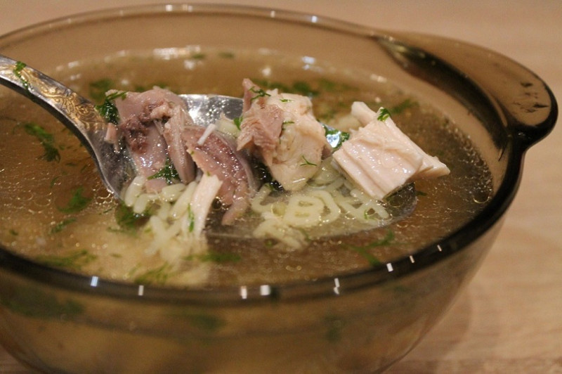 Про суп из курицы сегодня решила не рассказывать из этических соображений, 14 ноября - Всемирный день курицы. Но день заканчивается, "уж полночь близится", про суп из петуха рискну рассказать. А про курицу в другой раз. Суп как суп, ничего необыкновенного. Разве что не из магазинной курицы в пакете, а их деревенского петуха, который бегал по травке и клевал натуральную куриную еду. Моя мысль о другом - как сохранить часть бульона "про запас", чтобы в другой раз, когда нужен будет супчик, просто быстренько добавить в бульон всё, что для супа нужно. И готово. Экономия времени получается. И свежий супчик. Что немаловажно - другой супчик. Предлагаю заморозить. А чтобы не занимать посуду и место в холодильнике - заморозить в пакете "кирпичиком". В плоский контейнер застилаю пакет, он должен быть целый, без дырочки, желательно новый, а еще лучше, специальный для заморозки (на таких фломастером на специальной бирочке можно написать, что это, хотя по форме "кирпич" и так будет понятно, что