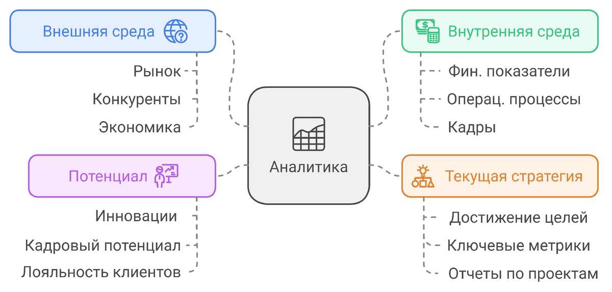 Первый шаг подготовки к стратегической сессии (СС) — это сбор и обработка аналитических данных. Для эффективной работы на этом этапе важно провести декомпозицию, которая поможет сформировать список необходимых данных и упорядочить задачи. Это обеспечит структурированную информацию и понятный процесс подготовки для всей команды. Обычно, на первых встречах я использую интеллект-карты (MindMap, см. на картинке выше), которые помогают структурировать типы информации и синхронизировать команду. Далее, если команде необходим более детализированный план — оформляем в виде таблицы или диаграммы Ганта с указанием ответственных и сроков. Шаблон плана сбора аналитики с примерами доступен по ссылке. Интересуетесь темой управления бизнесом? Загляните в мой Telegram-канал — буду рада поделиться своими опытом и инсайтами от оптимизации процессов до выхода на новые рынки.