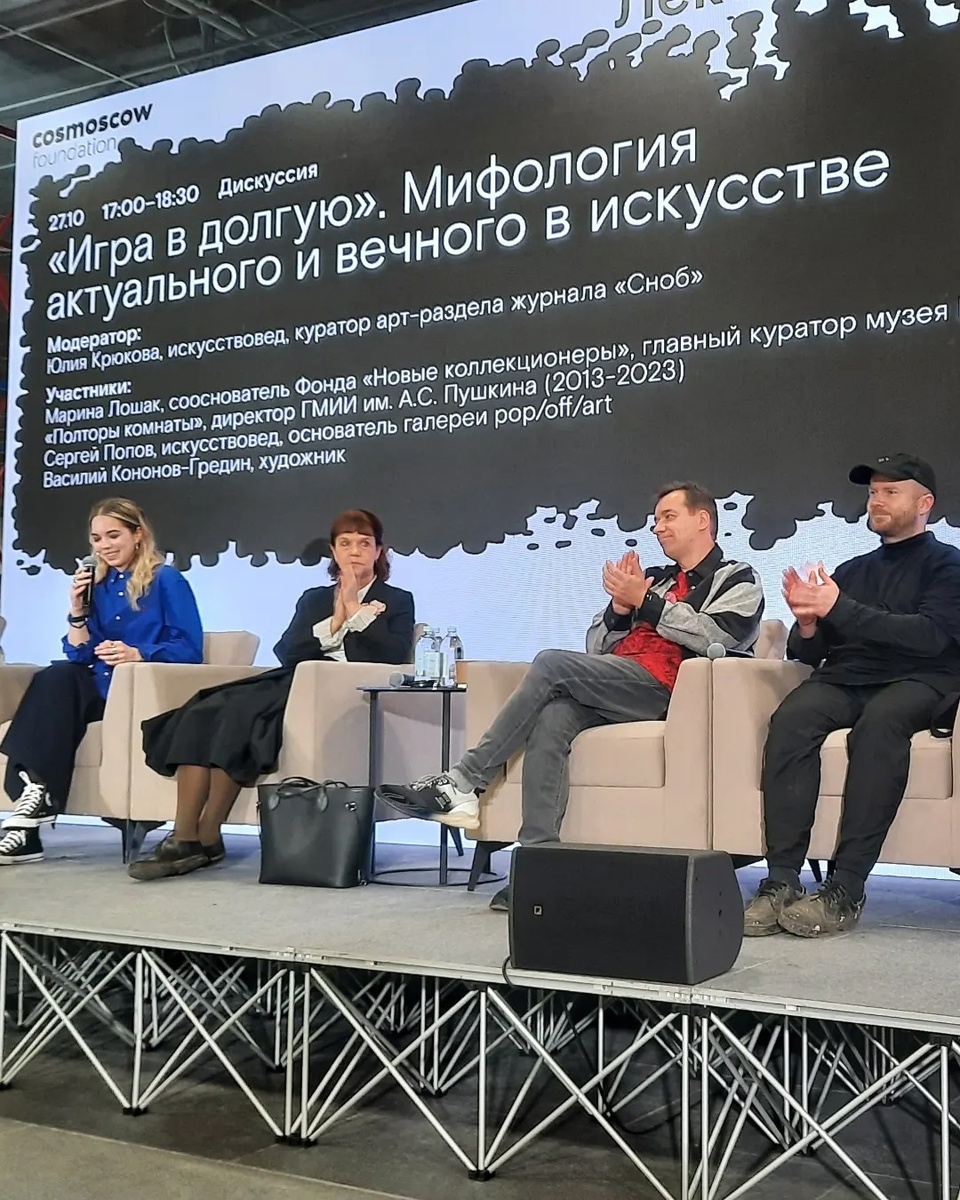 Дискуссия на ярмарке современного искусства Cosmoscow 2024 «Игра в долгую» Мифология актуального и вечного в искусстве». Модератор Юлия Крюкова – искусствовед, куратор арт-раздела журнала «Сноб». Участники дискуссии: Марина Лошак – экс-директор «Пушкинского музея», главный куратор музея Иосифа Бродского «Полторы комнаты», сооснователь фонда «Новые коллекционеры», Сергей Попов – искусствовед, основатель галереи «Pop/off/art», Василий Кононов-Гредин – художник.