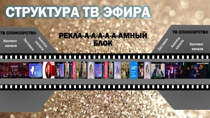 Сегодня расскажу о том, что у нас, рекламщиков, как говорится, на «подкорке», но на чем мне хочется остановиться отдельно. И всё-таки, чем отличается спонсорство на ТВ от прямой рекламы на ТВ? Классическое определение звучит так: прямая реклама — это то, что показывается на канале после отбивки «реклама». Всё остальное — спонсорство. Если у вас дома постоянно включен эфирный телек, вы знаете, о чём я. А теперь поднимите руки, у кого дома есть и постоянно включен эфирный телек? Вот-вот. Наше поколение не смотрит ТВ и даже гордится этим. Мы — это Y, Z и тем более альфы, которые уже позаканчивали институты (на минуточку!) и тоже работают в отделах маркетинга и рекламы… тут можно почувствовать себя старичком. Мы, конечно же, знаем и смотрим ТВ-шоу, если они совпадают с нашими вкусами или вкусами целевой аудитории нашего бренда. Но сами мы НЕ СМОТРИМ ТЕЛЕВИЗОР! Сегодня я расскажу о структуре эфира, нарисую картинку. Вот так выглядит телевизионный эфир. ➡️Сначала идет программа/шо