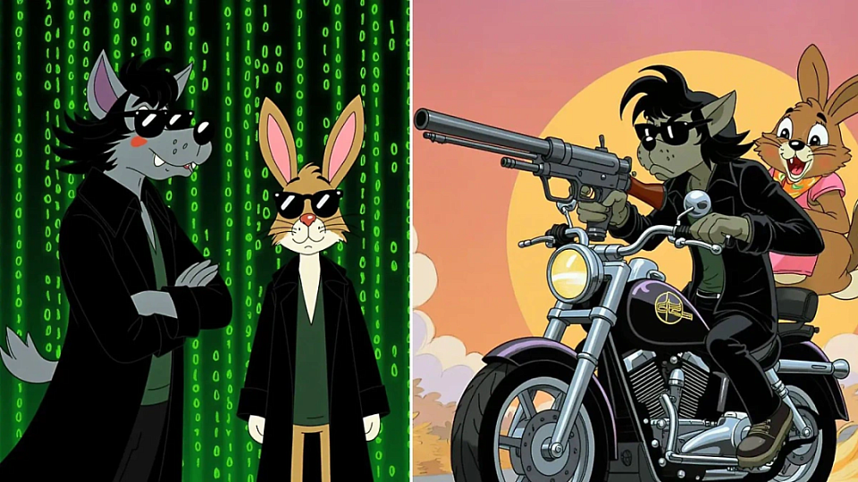 Искусственный интеллект смешал миры: герои советского мультсериала «Ну, погоди!» ожили в образах из культовых кинофильмов. Представьте себе Зайца в роли джедая и Волка, перевоплотившегося в Джеймса Бонда. Сейчас вы это увидите! Нейросети не устают удивлять своими возможностями. Теперь они позволяют перенести знакомых нам героев в совершенно новые реалии. Персонажам предстоит пройти через временные петли и встречи с необычными существами. А во вселенной «Бегущего по лезвию» наших героев ждут испытания в мире с искусственными людьми и мутантами. В космосе Заяц и Волк также нашли своё место. В «Звёздном пути» они участвуют в межгалактической гонке, а в «Звёздных войнах» Заяц в сером костюме сталкивается с Волком-Дартом Вейдером. Их сражение за справедливость переносит нас в открытый космос, где каждый борется за свои идеалы. Не обошлось и без супергероев: в мире «Бэтмена» Заяц становится помощником супергероя, а Волк надевает маску Бэтмена. В «Зверополисе» роли меняются местами: Заяц в ро