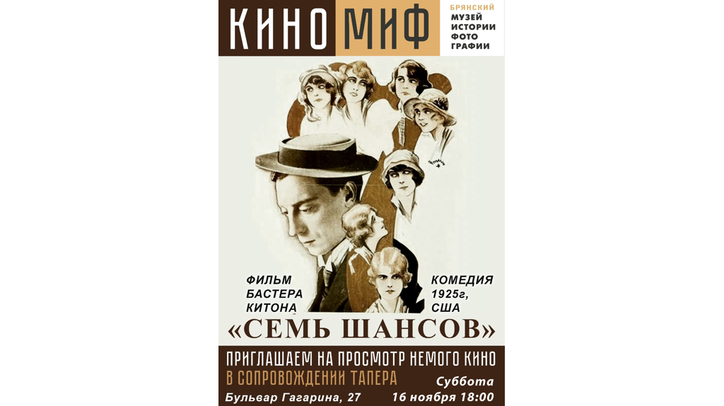 Музей истории фотографии приглашаем брянцев на киносеанс. Он состоится в субботу, 16 ноября. Начало в 18 часов. В рамкам проекта «КИНОМИФ» будут продемонстрированы публике шедевры немого кино в сопровождении тапера. Все как в старые добрые времена начала XX века, черно-белая картинка с титрами и живая музыка. Проверенное временем кино – комедия 1925 года с Бастером Китоном в главной роли. «Семь шансов» рассказывает о нерешительном молодом человеке, которому судьба дала возможность за один день стать богатым и счастливым, получив наследство. Но для этого ему надо жениться. 18+ ФОТО: МИФ — Музей Истории Фотографии | Брянск В Брянске состоится показ немого кино в сопровождении тапера
