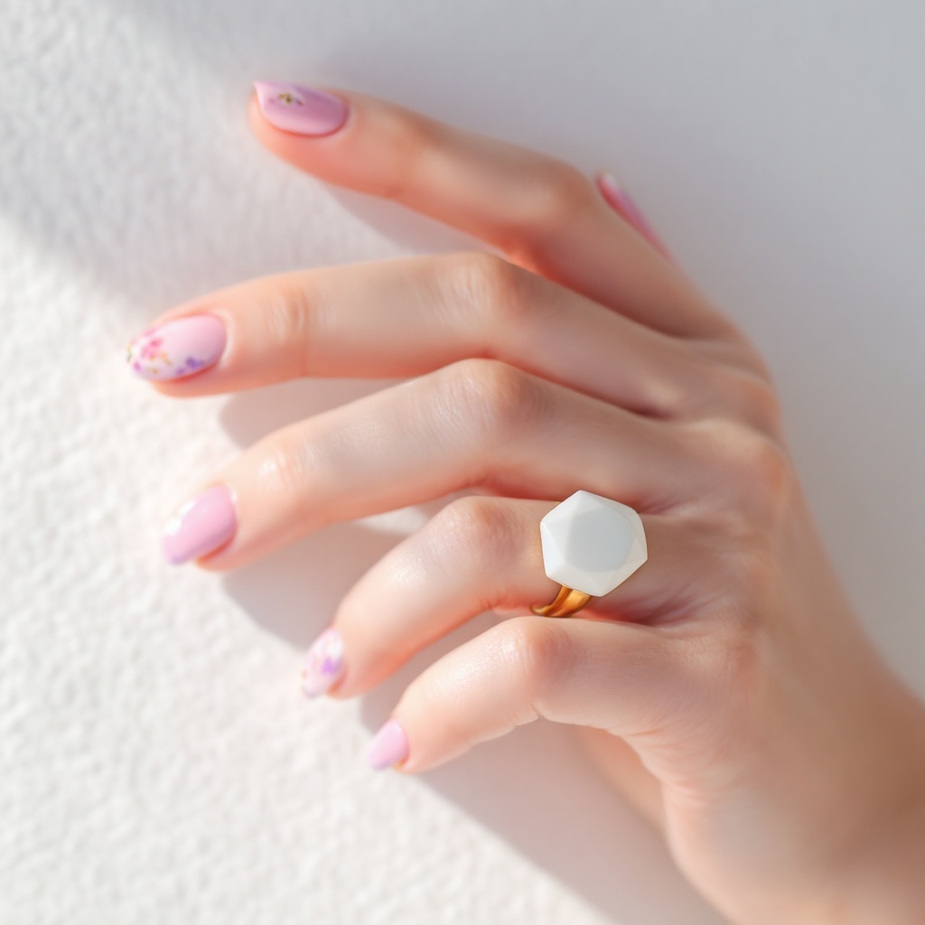 Безупречный маникюр, который покорит сердца Погрузитесь в мир утонченной элегантности с этим безупречно выполненным маникюром, который станет великолепным акцентом для любого образа. Представленные на фотографии ногти украшаются нежными пастельными оттенками — светло-розовым, лавандовым и с легким бежевым пигментом. Это сочетание создает романтичную и мягкую атмосферу, идеально подходящую как для повседневного стиля, так и для особых мероприятий. Каждый ноготь в этом маникюре обработан с заботой и вниманием, уложен в идеальную форму и блеск. Восхитительные золотые акценты и утонченные цветочные мотивы придают дополнительную изысканность и уникальность, делая маникюр настоящим произведением искусства. Использование лака от CND Shellac в оттенке «Beau» вместе с топовым покрытием Seche Vite обеспечивает не только долговечный блеск, но и стойкость, позволяя вам наслаждаться безупречным видом ногтей в течение длительного времени. Изысканный белый геометрический кольцо добавляет яр