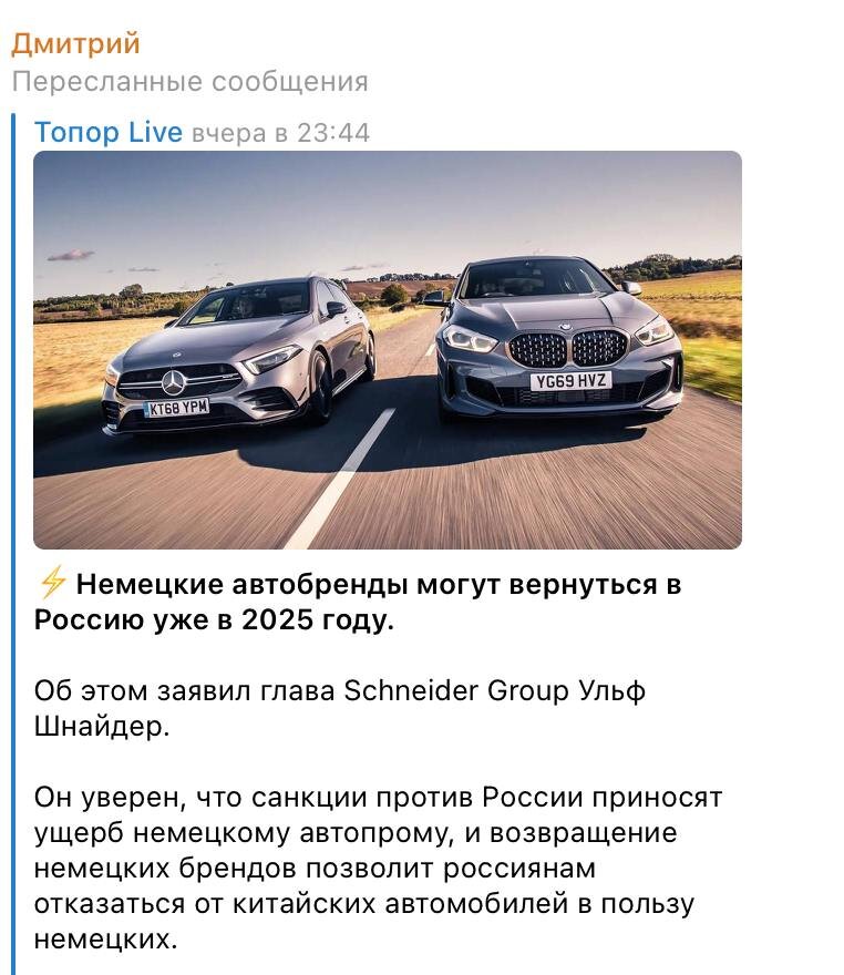 По интернету активно форсится новость, что немецкие автомобильные компании готовы вернуться в РФ! Объясняю, что конкретно произошло: Вышел Ульф Шнайдер и такой «товарищи ! Отвечаю, немецким автомобильным компаниям надо шевелить батоном и возвращаться обратно в Россию, пока они тут все к китайцам не привыкли. Пока что, ещё можно переломить ситуацию и можно вернуться и отжать продажи обратно. Плюс, мы видим, что санкции не работают, поэтому давайте уже возобновляться!». И всё на этом. Просто вышел человек и вот это вот сказал. Но, тут есть нюанс, что к автомобильной промышленности он вообще не имеет никакого отношения. Это вообще бывший гендир Нестле. И, видимо, просто надо поднабрать цитируемости, надо лишний раз засветиться везде, где только можно, чтобы, в том числе, иметь возможность как-то поучаствовать в возвращении немецких компаний в Россию. Типа «меня тут знают, меня тут любят, так как я всегда говорил и говорю, что останавливать бизнес с Россией было тупой идеей, поэто