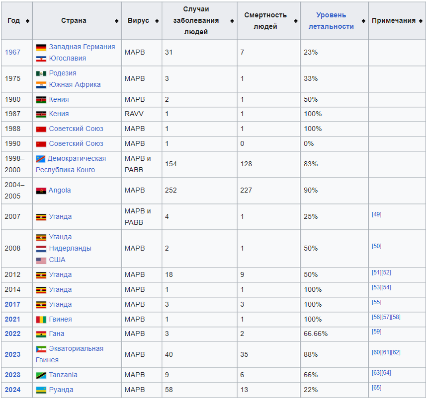 - Средний коэффициент летальности заболевания составляет порядка 50%. В ходе прошлых вспышек коэффициент летальности варьировался в диапазоне 24-88% в зависимости от штамма вируса и качества оказания медицинской помощи.