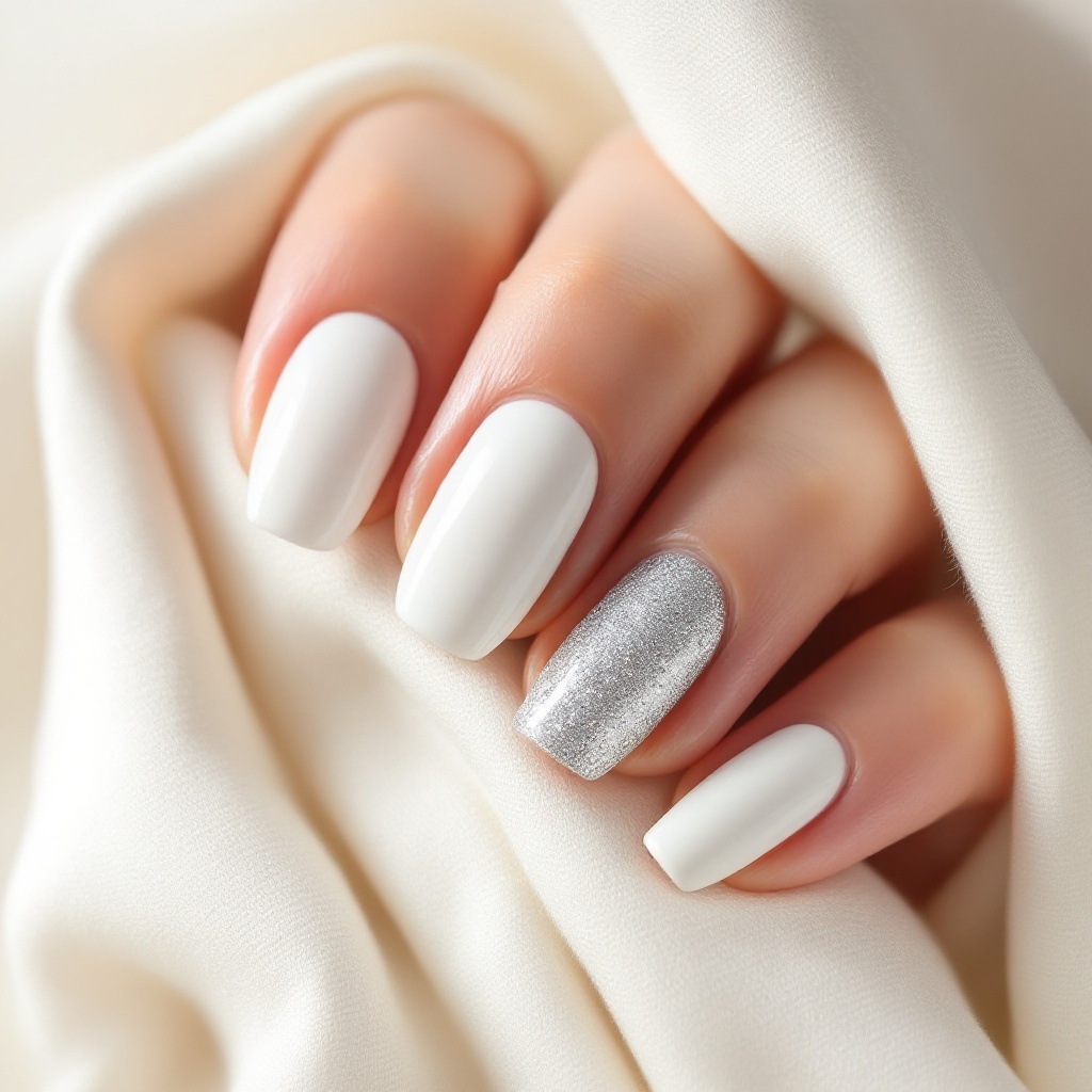 Искусство маникюра, которое завораживает взгляд В мире моды маникюр становится неотъемлемой частью вашего стиля, и это изысканное оформление ногтей – яркий тому пример. Представленные на изображении элегантные ногти, насыщенные мягкими белыми оттенками с пронзительными искорками серебра, создали атмосферу утонченности и шарма. Четыре безупречно оформленных ногтя сияют белоснежным лаком, который, возможно, сеялся из серии «Brilliance White» от L’Oréal, а один акцентированный ноготь великолепно украшен блестками из коллекции «Galactic Glam» от OPI, придавая общему образу игривую нотку. Техника нанесения, используемая для создания этого маникюра, включает в себя тщательное выравнивание формы ногтей и безукоризненное покрытие слоем топового покрытия, чтобы обеспечить идеальный глянец. Такой маникюр отлично подойдет для разнообразных мероприятий – от романтического свидания до важного делового совещания, подчеркивая вашу уверенность и стиль. Не бойтесь использовать этот