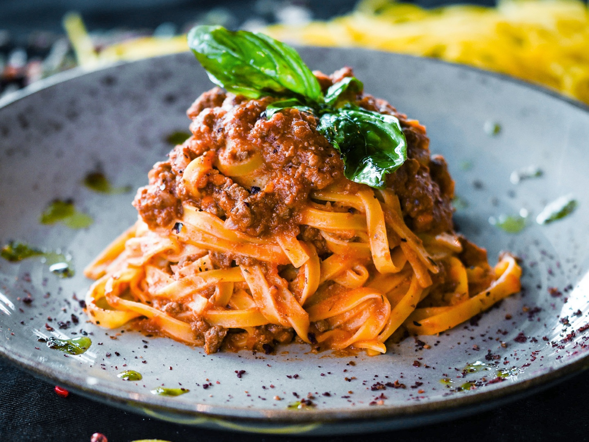 ИНГРЕДИЕНТЫ/4 ПОРЦИИ: 500 г говядины для тушения, 300 г пасты, 800 г консервированных томатов, 2 морковки, 1 стебель сельдерея, 1 луковица, 200 мл красного сухого вина, 50 г пармезана, 1 ч.л сушеного орегано, пучок свежего базиика, 1 зубчик чеснока, 3 ст.л оливкового масла, 2 ст.л томатной пасты, соль, перец