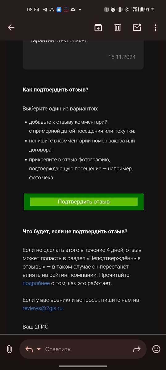 Приходит сообщение на почту от 2 ГИС, нужно подтвердить отзыв