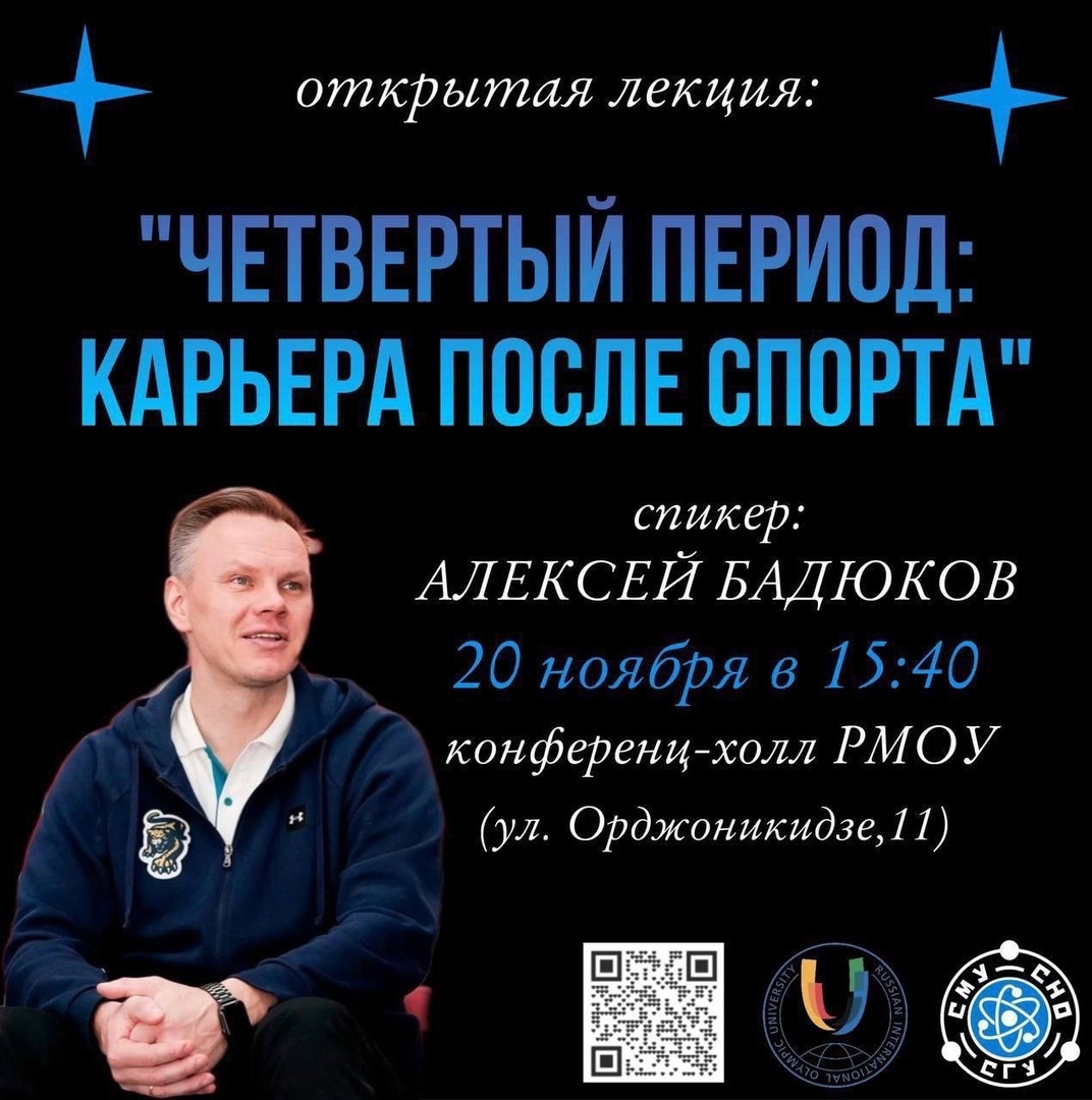 Приглашаем вас на открытую лекцию, организованную совместно с Российским Международным Олимпийским Университетом, на тему "Четвертый сезон: карьера после спорта". Спикер: Алексей Бадюков, заместитель генерального директора по хоккейным операциям ХК «Сочи», прославленный российский хоккеист, чемпион России, двукратный обладатель Кубка Гагарина, эксперт и комментатор телеканала «Матч ТВ» и КХЛ ТВ. Алексей Бадюков поделится своим опытом и расскажет о том, как построить успешную карьеру после завершения спортивной деятельности. Лекция будет интересна: Вход свободный, но по предварительной регистрации || https://forms.yandex.ru/u/673232b0c417f31caad837bb/ Организатор мероприятия: СМУ СНО СГУ.