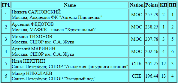 У Никиты Сарновского (257.79 - 1 место🥇) вернуться получилось, причем это уже его не первое возвращение после травмы. Сегодня Никита стал безусловным победителем с двумя четверными лутцами в первой половине программы и с двумя тройными акселями во второй половине.
