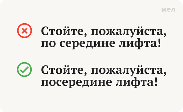 Сегодня разбираемся с предлогами, образованными от существительных, и сложностями их правописания. Из-за того, что большинство таких предлогов и существительные, с которыми их путают, — омонимы, иногда бывает непросто понять, слитно их писать или раздельно. Правильно: посередине Наречие «посередине» (посредине, посередке) в большинстве случаев пишется слитно и используется для указания местоположения, то есть отвечает на вопрос «где?» Обычно оно используется вместе с существительным в родительном падеже и его можно заменить словосочетанием «в центре». Существительное с предлогом «по середине», с которым его можно перепутать, пишется раздельно — и это крайне редкий случай. Обычно в таком предложении акцент делается именно на слове «середина»: Больше полезных карточек о русском языке — в «Грамотности» на «Меле» в Telegram. Подписывайтесь, чтобы говорить и писать правильно. Обложка: Vvicca1 / Shutterstock / Fotodom
