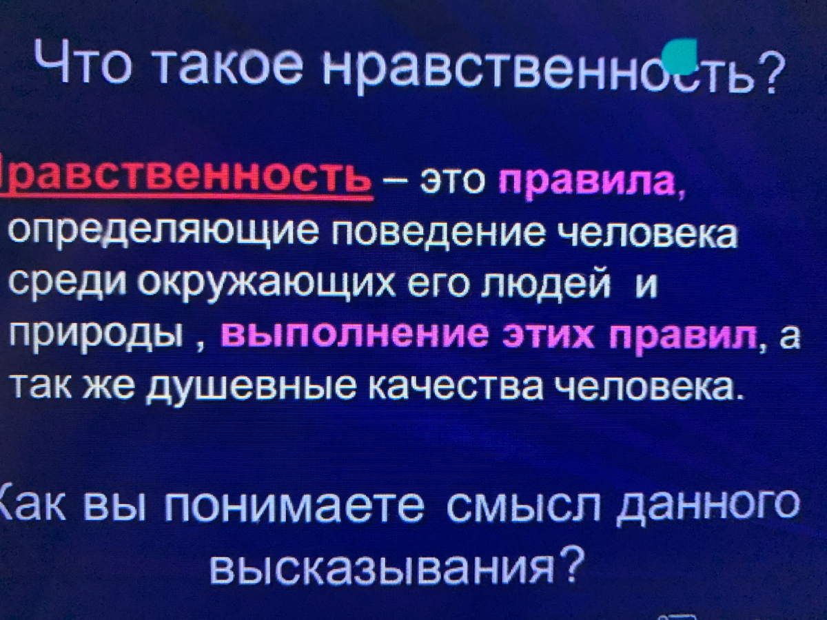 Нравственность выражает суть поступков людей во всех сферах жизнедеятельности жизни семьи, народа, государства, когда общественные и общечеловеческие требования совпадают с внутренними мотивами, побуждающими творить добро», когда духовные ценности личности - мотивируют личность применять ее предписания в различных жизненных ситуациях.