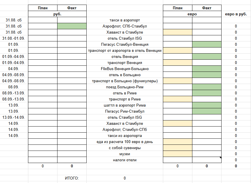 Заранее, когда рассчитываю поездку - вписываю суммы в раздел ПЛАН, обычно они округленные. Потом, по мере оплат и броней - заполняю ФАКТ
