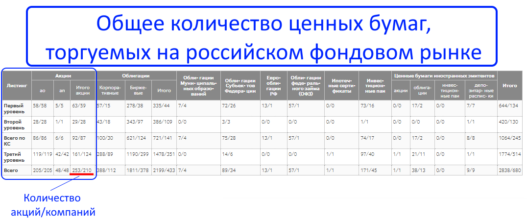 По данным Московской бирже на 1 ноября 2024г на нашем рынке присутствует 210 российских компаний-эмитентов, у которых на торги выставлены 253 акции (обычные+привилегированные):