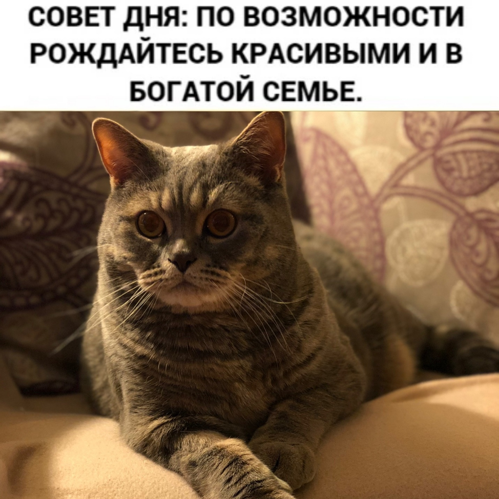 Следуйте заветам Карлсона – сохраняйте спокойствие. 😺😺😺 Если вы обвиняете в своих неудачах других людей, будьте последовательны: хвалите их за свои успехи. 😺😺😺 Излишнее старание рождает недомогание. Чтобы жилось легче, выбирайте собственную реальность. 😺😺😺 Что бы ни происходило, надо сохранять невозмутимость. 😺😺😺 В своих ожиданиях следует проявлять реалистичность. 😺😺😺 Если вам хочется поговорить, а не с кем, то поговорите сами с собой. Или с котом. В каждом возрасте существуют свои радости. Не пренебрегайте ими. 😺😺😺 Защитить от невзгод поможет чувство юмора. Живите менее серьезно и более игриво. 😺😺😺 Самое лучшее упражнение для рук – это пересчитывание денег. Снимает боль в суставах, нормализует давление, улучшает зрение, убирает головную боль, улучшает аппетит, решает жилищные проблемы. Чтобы дольше жить, надо ни с кем не спорить. 😺😺😺 Периодически делайте паузы ото всего и от всех. 😺😺😺 Ведите себя так, как будто вы доверяете людям. Но никогда этого не делай